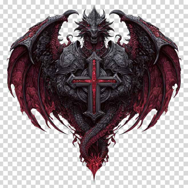 A masterpiece design of a scary and dark dragon with red open wings in front view and Sign of the cross on the center of the body. this design is also suitable for tattoo design on the body and back and arm.