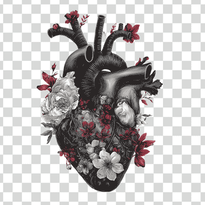 a 4K high quality of scary heart with little flower around it with theme suitable for tattoo design and print, transparent Background PNG.