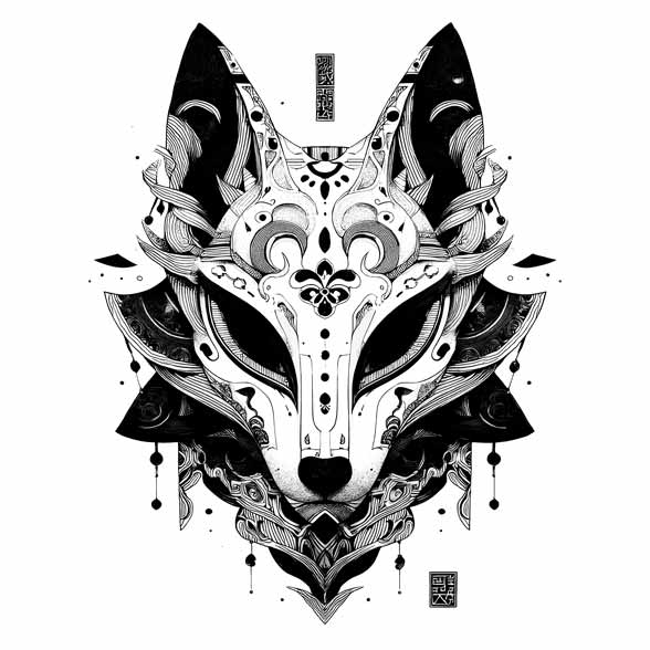 A black and white tattoo design of a kitsune tattoo design with fox element and transparent background and suitable for Artists to make kitsune tattoo style on the characters or make design on the t-shirt and bags.
