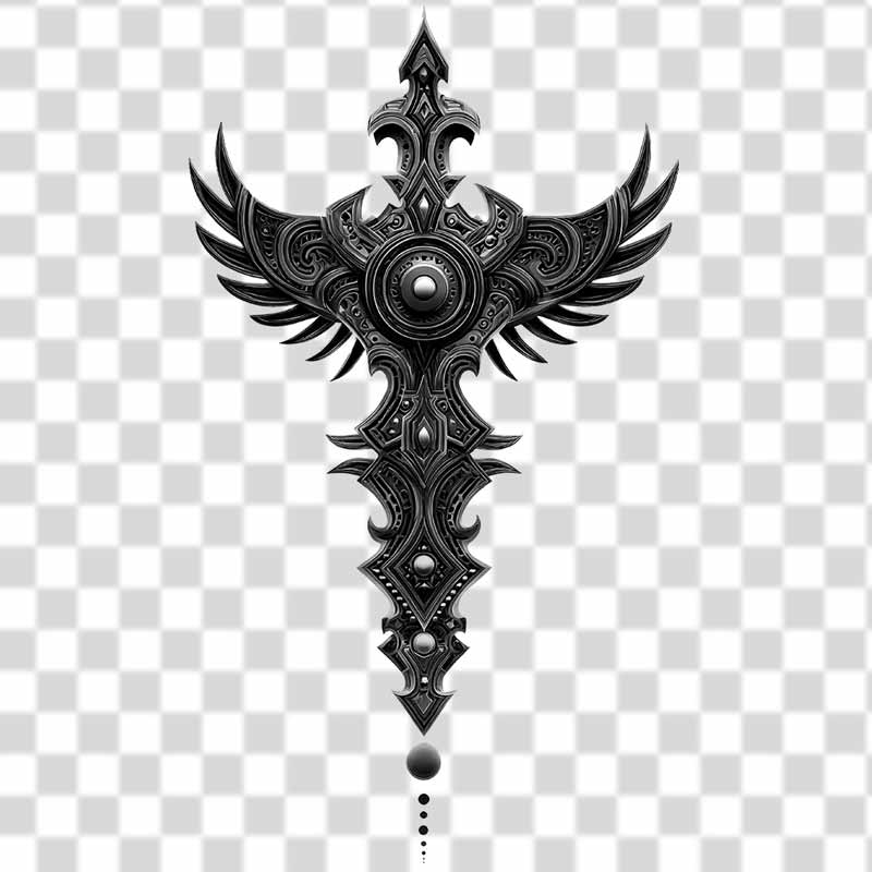 Free download tattoo of decorative emblem with sword theme tattoo design PNG with ornamental shapes around it and symmetrical and predominantly dark gray, suitable for tattoo on the body, back and sleeve.