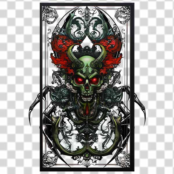 4K high quality of The skull is framed by intricate ornamental gothic style and decorative elements with green eyes and scorpion legs. suitable for tattoo design.