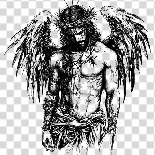 4k High quality of monochrome dark style illustration sad Christ with head in down and wings on the back. It’s amazing for tattoo design and free download in PNG format.