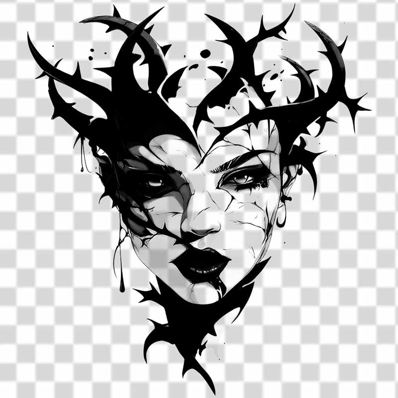 The design is ready to use without any watermark or background, making it perfect for professional tattoo and design projects. masterpiece design of a face girl with sharp horns on the head and front view with dark and terrify theme and black lips and suitable convey feel romantic.