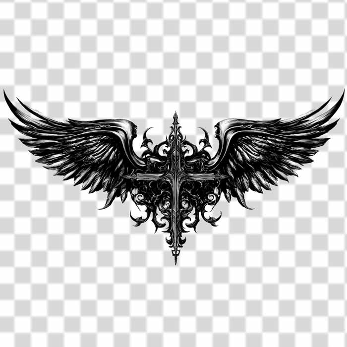 This PNG design comes with a fully transparent background and high resolution quality. giant wing with Christian cross in the middle with no background and black and white color.