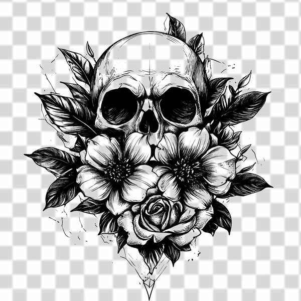 4k High quality of gothic style of illustration of a skull adorned with flowers and foliage and hollow eye sockets and nasal cavity in transparent Background, black and white PNG and use for tattoo design and print art.