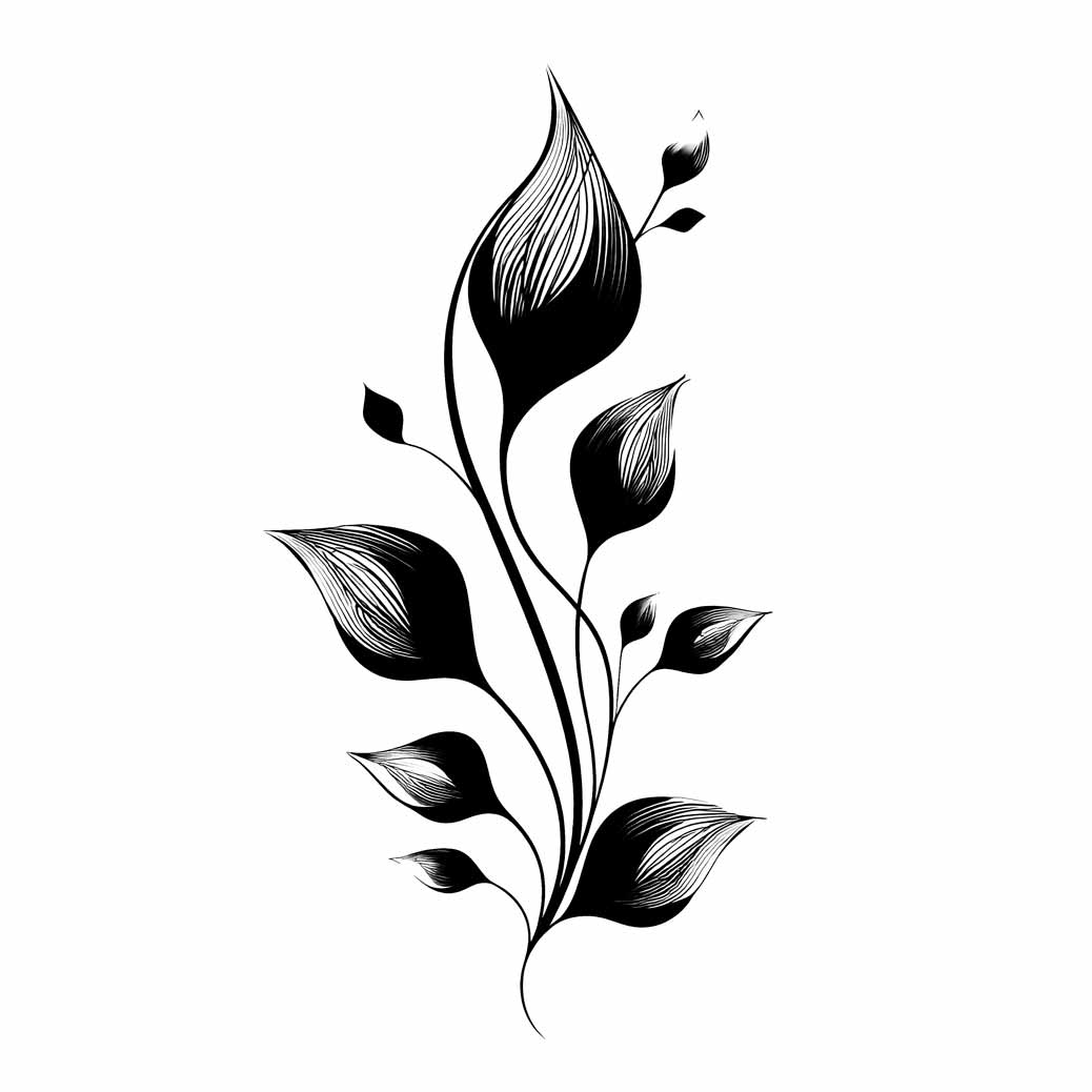 The image is a black and white graphic leaves illustration. The main subject is a plant stem. It curves gently upwards, starting with a thin and elegant line at the bottom. Emerging from the stem are several stylized leaves, each with a pointed shape reminiscent of lily pads or tulips, but with more elongated points. The leaves are filled with finely drawn lines that follow the shape of the leaf, providing a sense of texture and depth. These lines are closely spaced and create a gradient, making the leaves appear solid black while still hinting at the underlying structure.