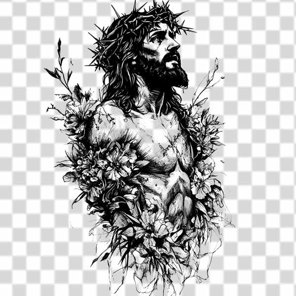 4k High quality of a muscular christ in the center with flowers in around it Transparent background and perfect for tattoo design as sleeve and for your arm. It’s free and easy to download.