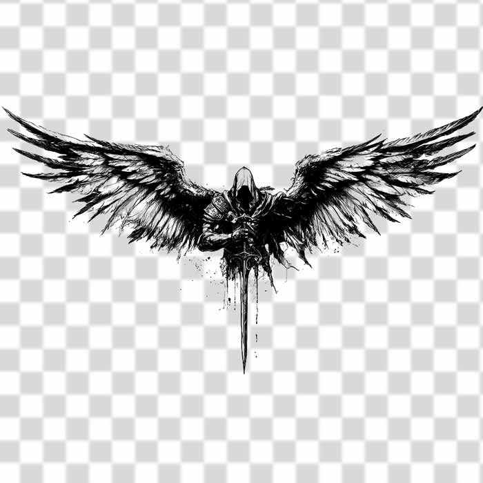 This PNG design comes with a fully transparent background and high resolution quality. black and white darkness warrior with sword and long and giant wings.