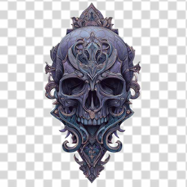 This PNG design comes with a fully transparent background and high resolution quality. The skull is deep purples, blues, and grays, with hints of metallic sheen, almost baroque-like, ornamental carvings.