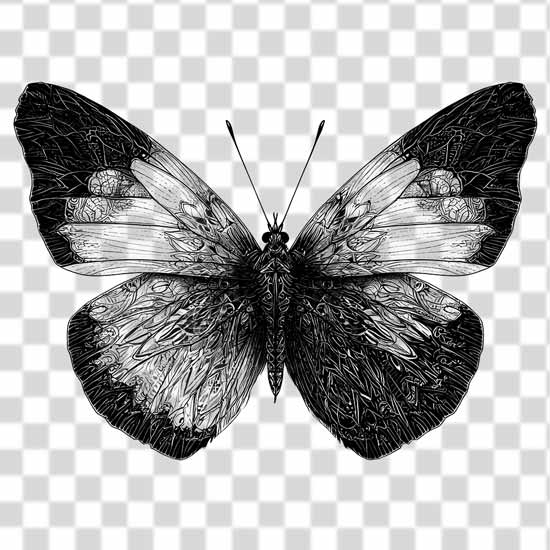 This PNG design comes with a fully transparent background and high resolution quality. tattoo design of a romantic butterfly with open wings and front view in monochrome.