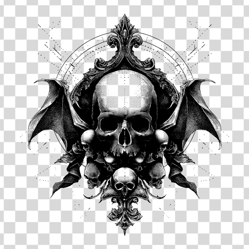 An illustration of 4k high quality of a set of dark skulls with black and white theme and giant wings in transparent Background