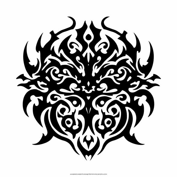 A symmetrical, ornamental design rendered in stark black against a white background. The design is complex, intricate, and appears to be inspired by tribal or tattoo art. The central element seems to be a stylized, organic form. It’s composed of various interconnected shapes: curved lines, swirling patterns, tear-drop shapes, and sharp, pointed edges. The overall shape is roughly circular or oval, with a high degree of symmetry about both vertical and horizontal axes. The details are dense and intricate. The design’s complexity is achieved through the interplay of solid black areas and negative space (the white background). The artist’s skill is evident in the precise execution of the lines and the balance between the filled and empty spaces. The color scheme is monochromatic, limited to black and white. This contrast emphasizes the design’s shapes and patterns, making them visually striking. The composition is centered, with the design occupying the majority of the frame, drawing the viewer’s eye directly to the intricate details. The overall effect is of a bold, graphic, and potentially symbolic design.