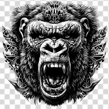 The design is ready to use without any watermark or background, black and white of gorilla‘s face with open mouth, sharp teeth and tribal designs around it in png background.