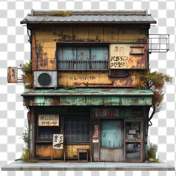 The design is ready to use without any watermark or background, a abandoned old building and japanese shop in the transparent background and cut out.